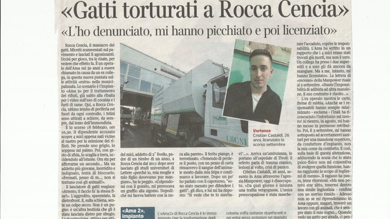 Stava facendo il suo solito lavoro, quando vede tre piccoli gattini di pochi giorni, se non appena nati, vicino al nastro dove scorre la spazzatura, e vede un suo collega (uomo di 50 anni) che ne afferra uno e lo sbatte a terra. Mio marito incredulo gli dice: PEZZO DI MERDA e lui innervosito afferra un altro gattino e glielo tira addosso, dopodiché non contendo lo tira dal cappuccio rompendoglielo, e lo spinge contro il muro facendogli sbattere la testa e dandogli una gomitata sullo zigomo. Tra l’altro c’erano altri due colleghi presenti a questa vicenda che hanno negato il tutto. Salendo alla sala manovra per andare a firmare prima di staccare, il suo collega (l’aggressore), fa al capoturno: metti a rapporto Castaldi e il capoturno risponde perché? Cosa è successo? e Cristian risponde: ho preso le botte per difendere dei gattini e il capoturno risponde: SI VEDE CHE NON TI HA MENATO PER I GATTI TE LE MERITAVI. Cioè vi rendete conto? un capoturno che deve segnare tutto anche se si fa un graffietto ha detto TE LE MERITAVI!!! Io sono sconvolta, ma non è mica finita qui ragazzi PURTROPPO.